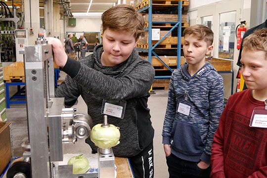 Nach einem Betriebsrundgang, geleitet von den Azubis, ging es zur Wilhelm-Kaisen-Schule zum gemeinsamen Mittagessen. Anschließend wurde die Ausbildungswerkstatt besucht, in der die Kids selber praktische Erfahrungen sammeln konnten. Wer weiß – möglicherweise ist einer von ihnen später selber als Azubi in der Ausbildungswerkstatt.
